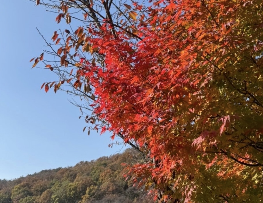 창밖으로 펼쳐지는 붉은 단풍 물결에